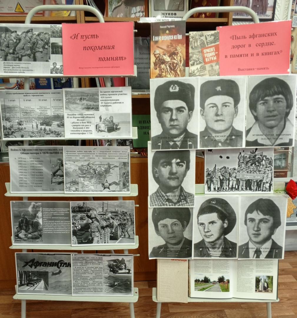 «У времени есть своя память - история. Поэтому нельзя никогда забывать о человеческих трагедиях, уносящих миллионы жизней и оставляющих глубокие следы в наших душах и сердцах. А чтобы не забыть - надо знать и помнить» - отметил Генадий Вячеславович . Учащимся были продемонстрированы видеофильмы: «Хроника афганской войны» , «Воины –интернационалисты Хойникщины». Была оформлена тематическая выставка «Пыль афганских дорог в сердце, в памяти и в книгах».