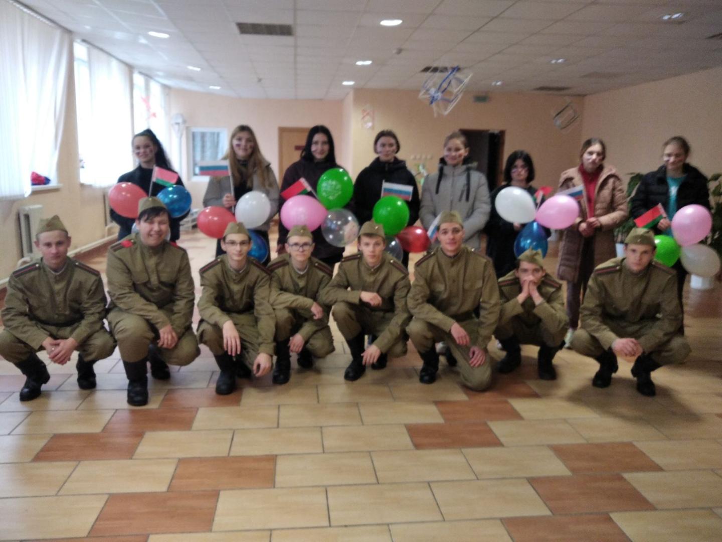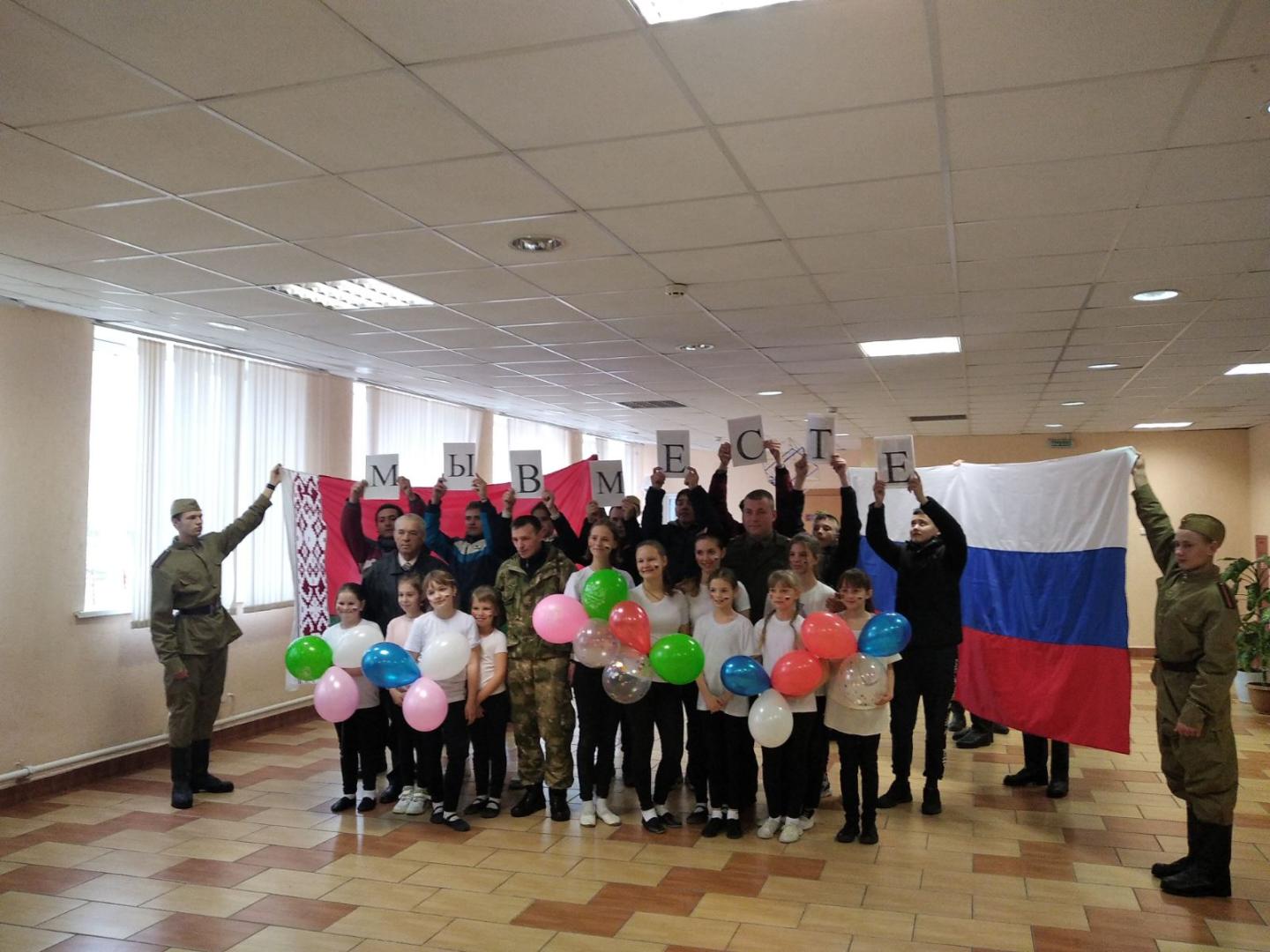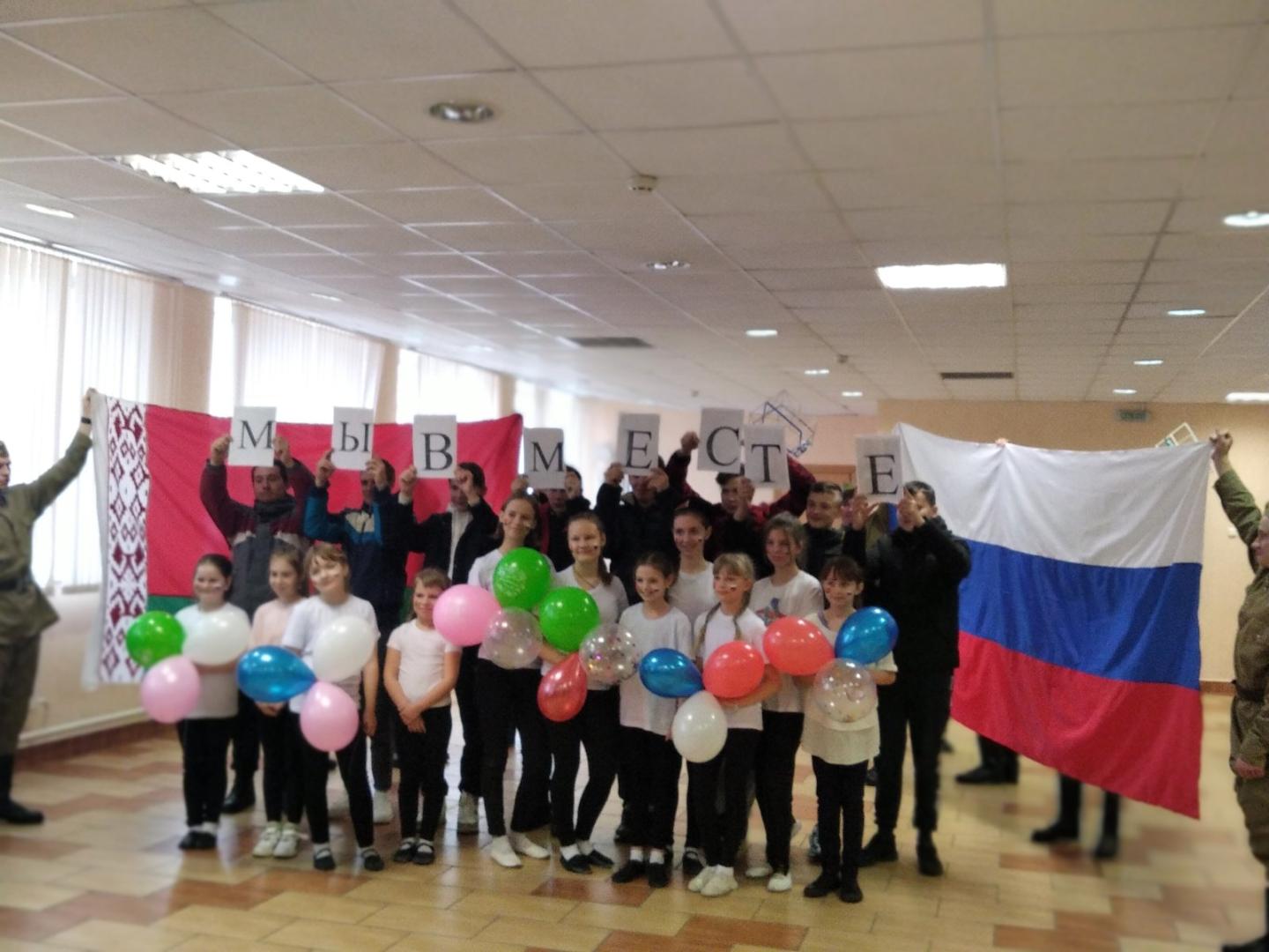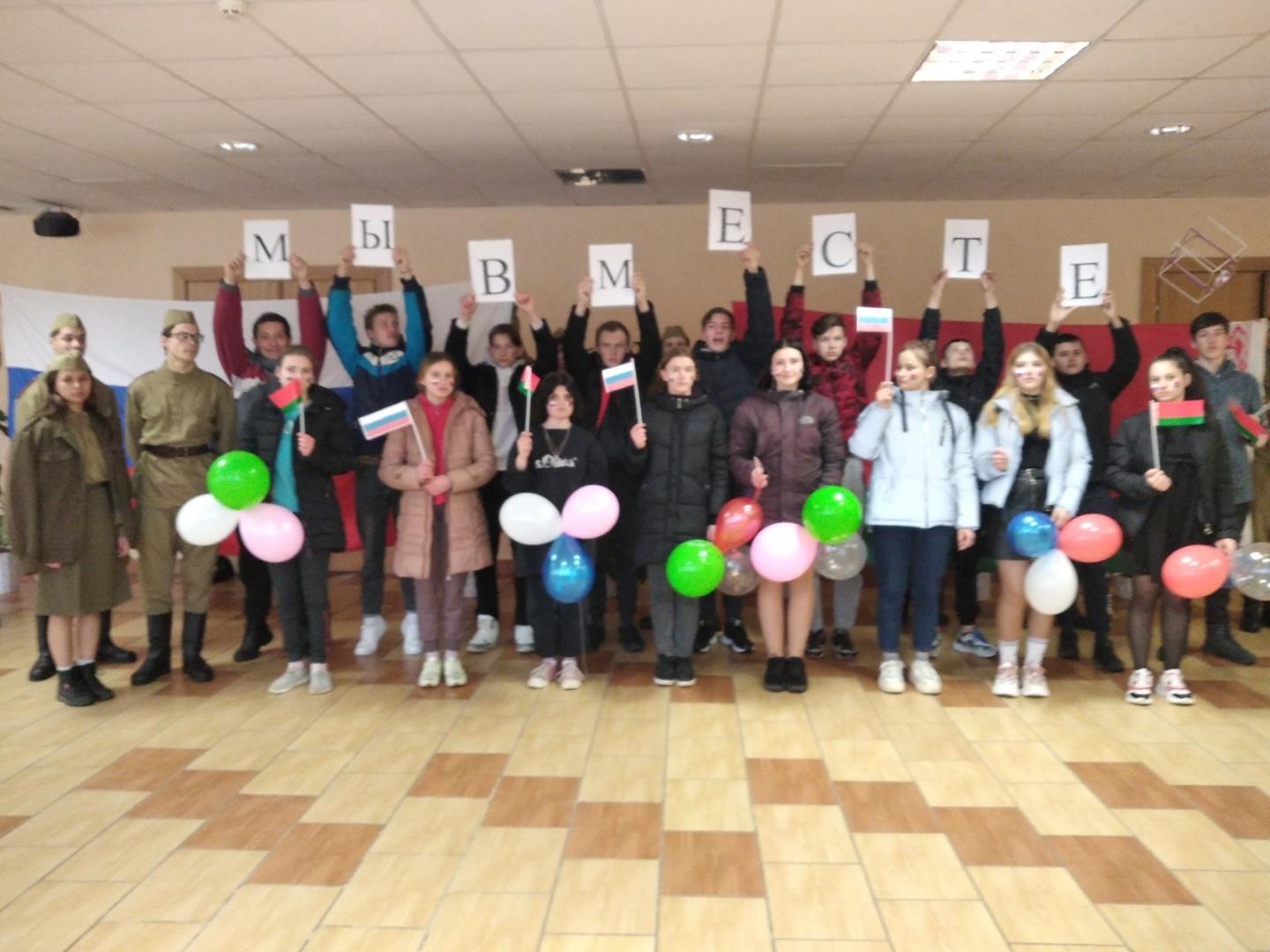 Ко дню единения народов России и Беларуси ,прошел тематический флешмоб «Мы вместе», в котором приняли участие ребята нашего лицея, поисковой отряд «Молодая гвардия» и танцевальный коллектив «Незабудки» РДК. Пригласили и почетных гостей: личный состав военкомата Хойникского района, заместителя председателя ветеранской организации Блища И.М.