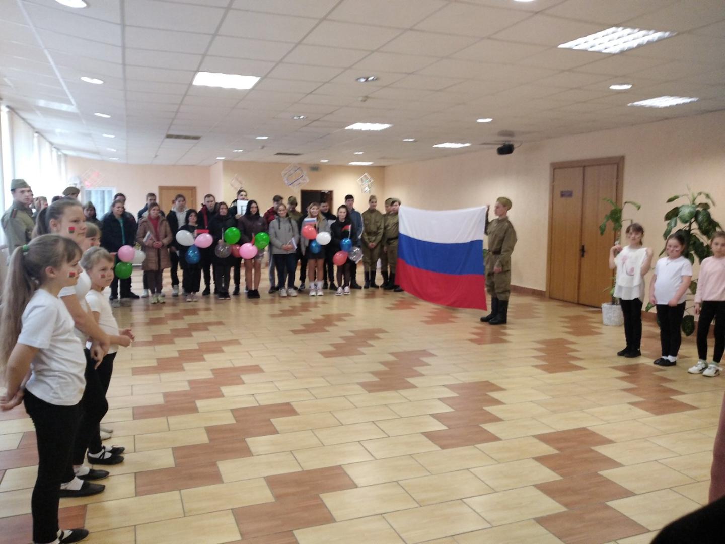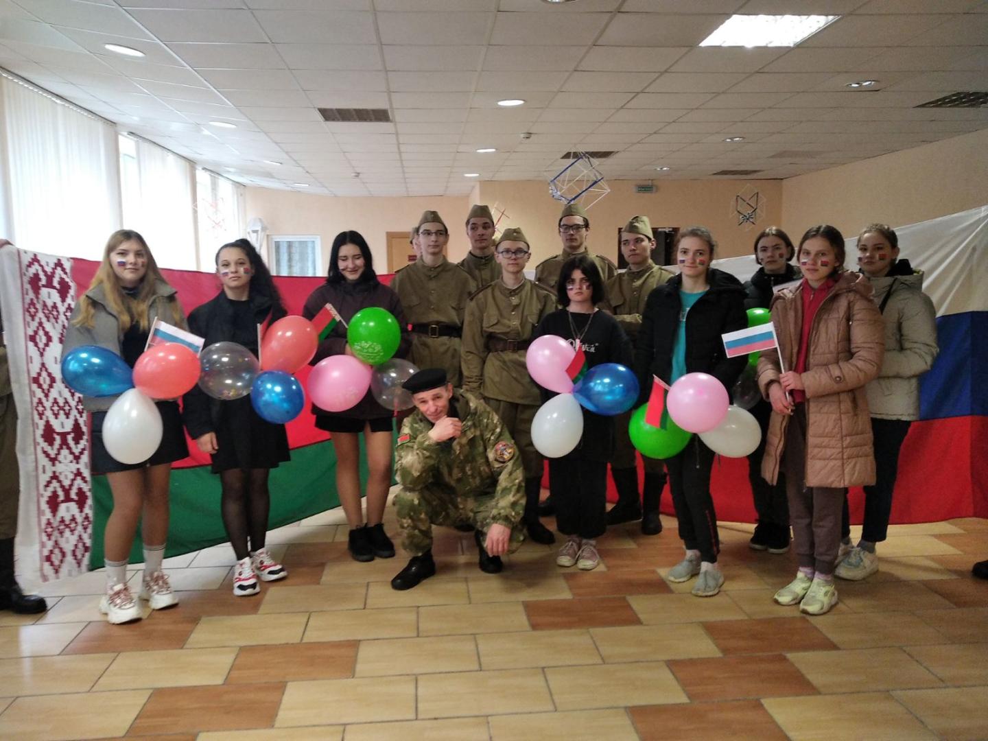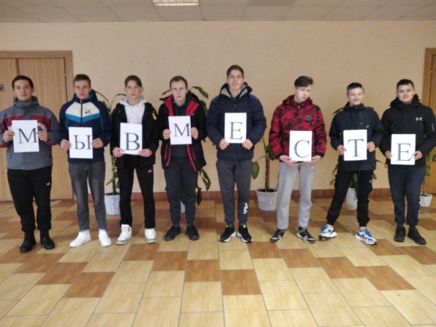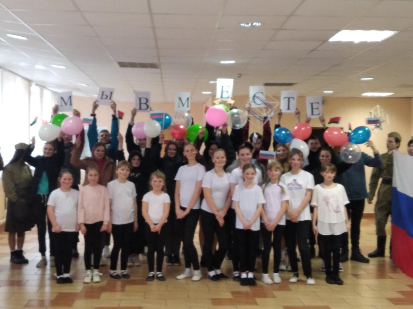 Ко дню единения народов России и Беларуси ,прошел тематический флешмоб «Мы вместе», в котором приняли участие ребята нашего лицея, поисковой отряд «Молодая гвардия» и танцевальный коллектив «Незабудки» РДК. Пригласили и почетных гостей: личный состав военкомата Хойникского района, заместителя председателя ветеранской организации Блища И.М.