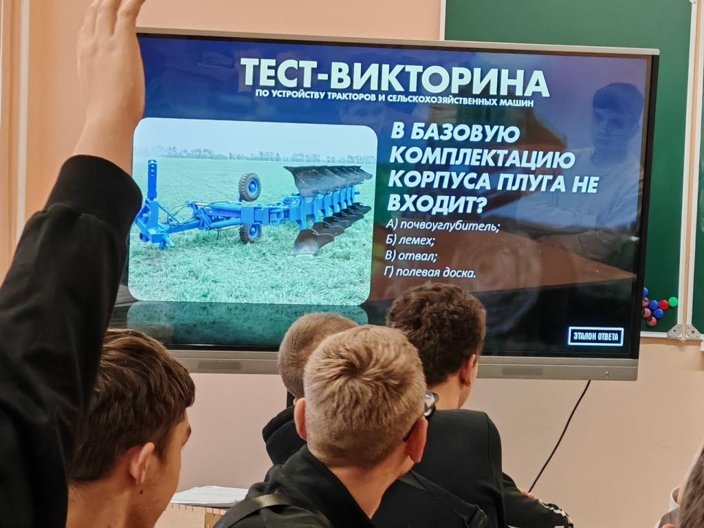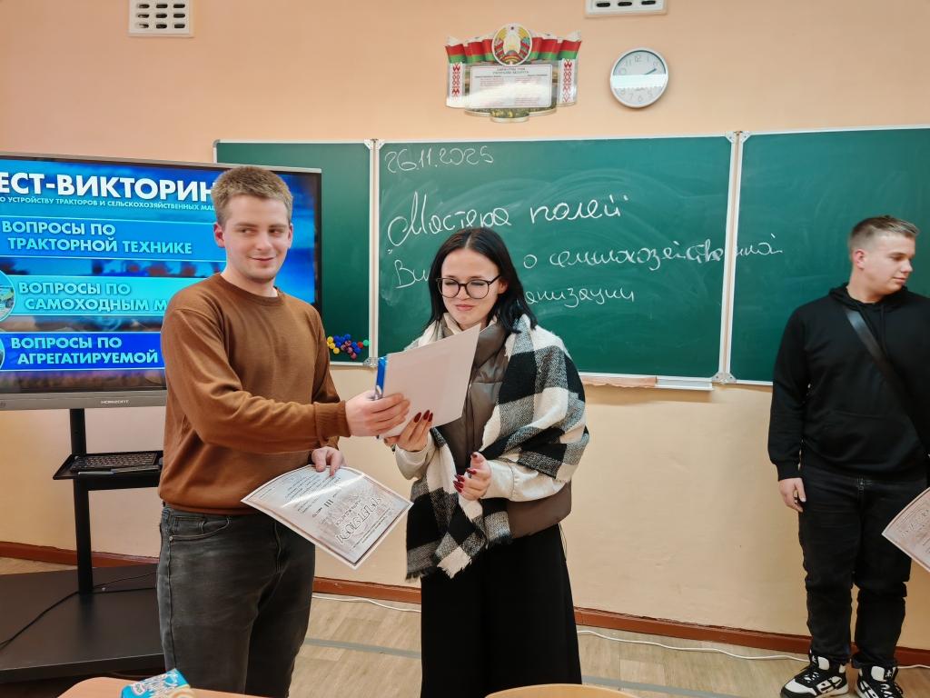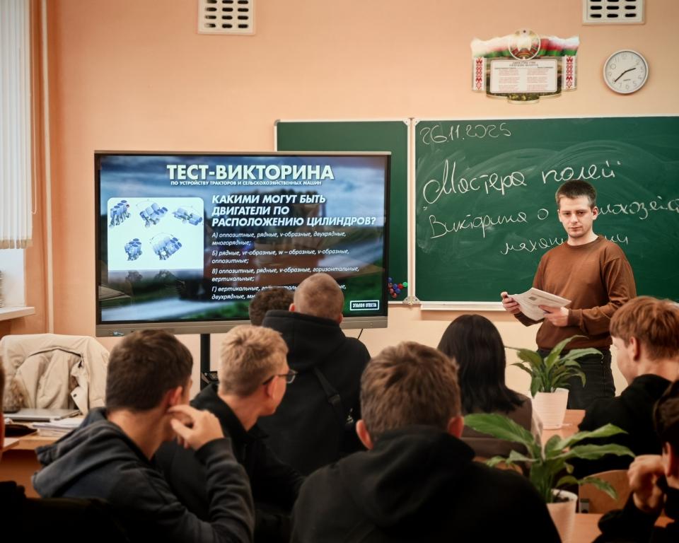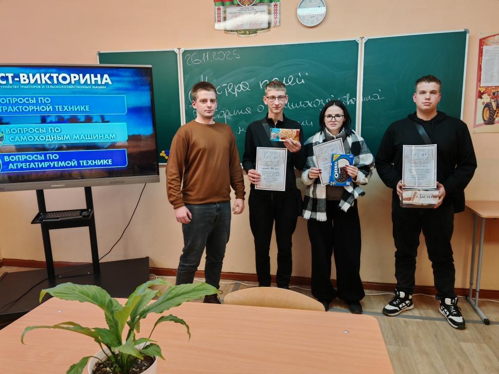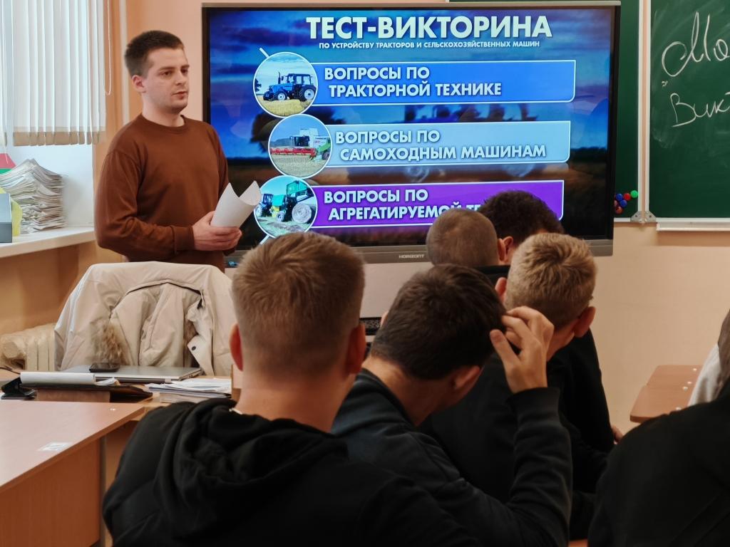 В рамках тематической недели «Мастер своего дела» по квалификации "Тракторист-машинист сельскохозяйственного производства" для учащихся колледжа преподаватель учебных предметов профессионального компонента Некрашевич Е.Д. провёл тест-викторину "Мастера полей. О сельскохозяйственной механизации". Ребята отвечали на вопросы по трём номинациям (в каждой - по 13 вопросов): тракторная техника, самоходные машины, агрегатируемая техника.