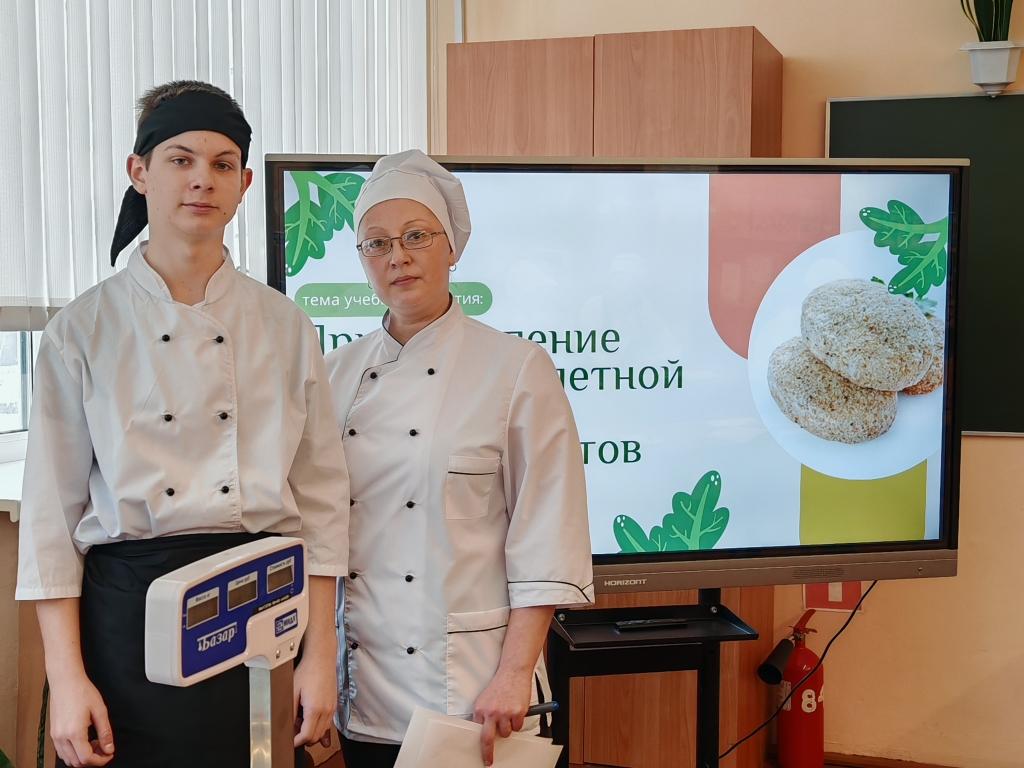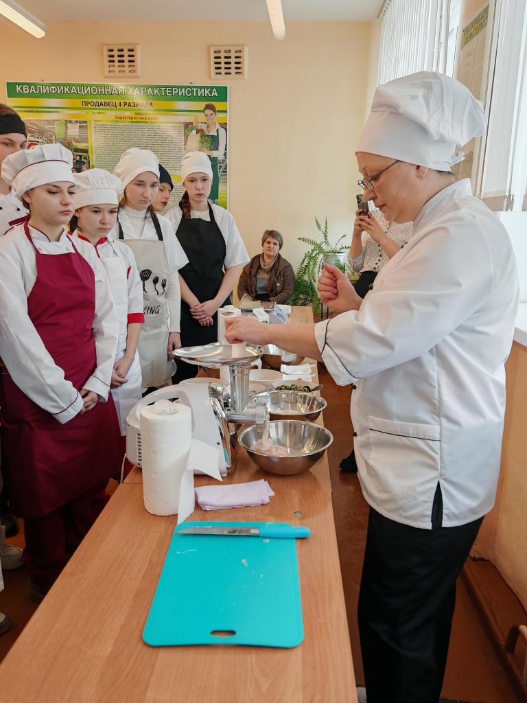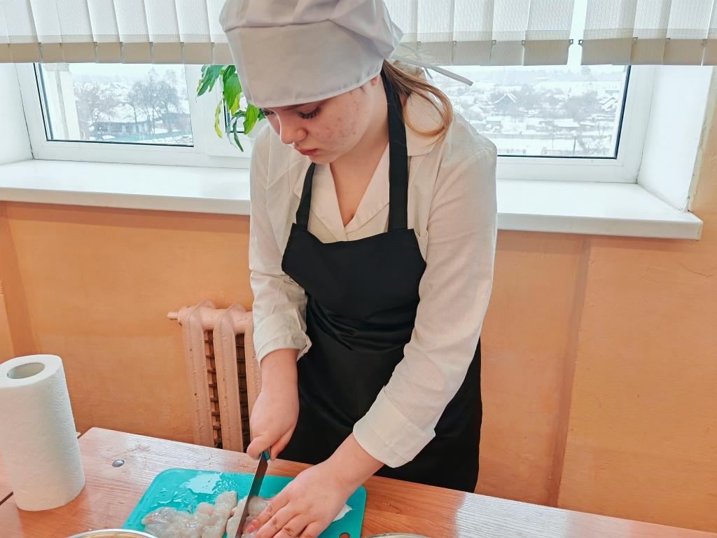В рамках работы цикловой комиссии преподавателей учебных предметов профессионального компонента и мастеров производственного обучения в колледже прошло открытое учебное занятие по учебному предмету "Производственное обучение" по теме «Приготовление рыбной котлетной массы и полуфабрикатов из нее». Учащиеся группы №28 учились определять доброкачественность сырья, приготавливать рыбную котлетную массу и полуфабрикаты из нее с соблюдением техники безопасности, личной гигиены.