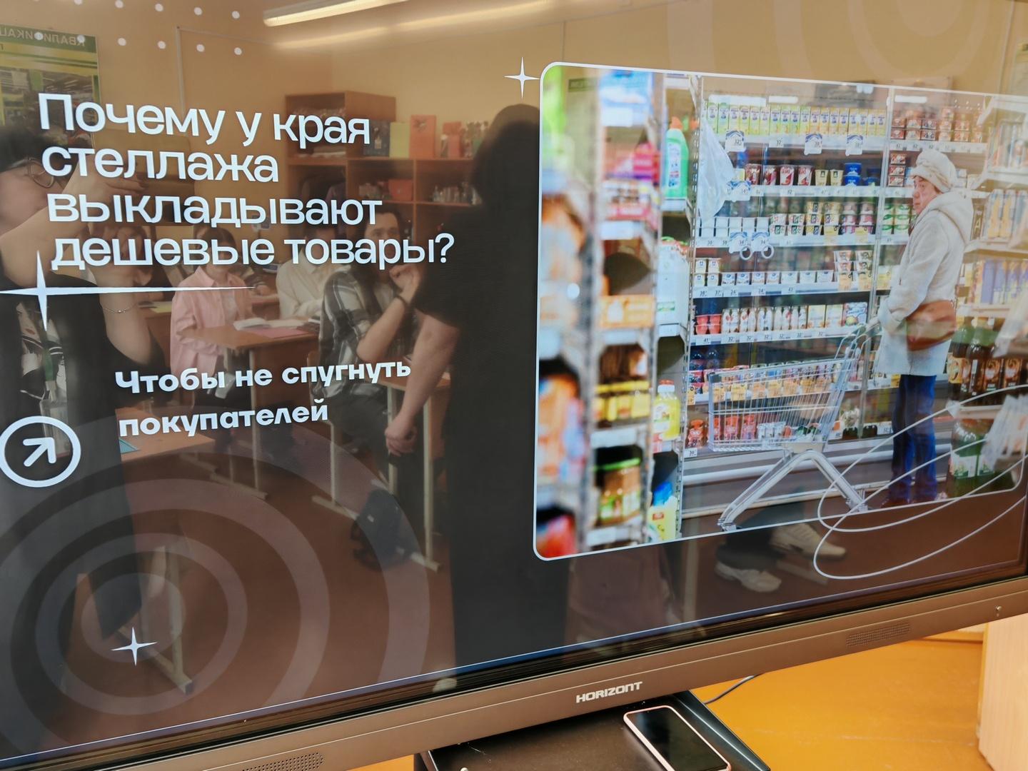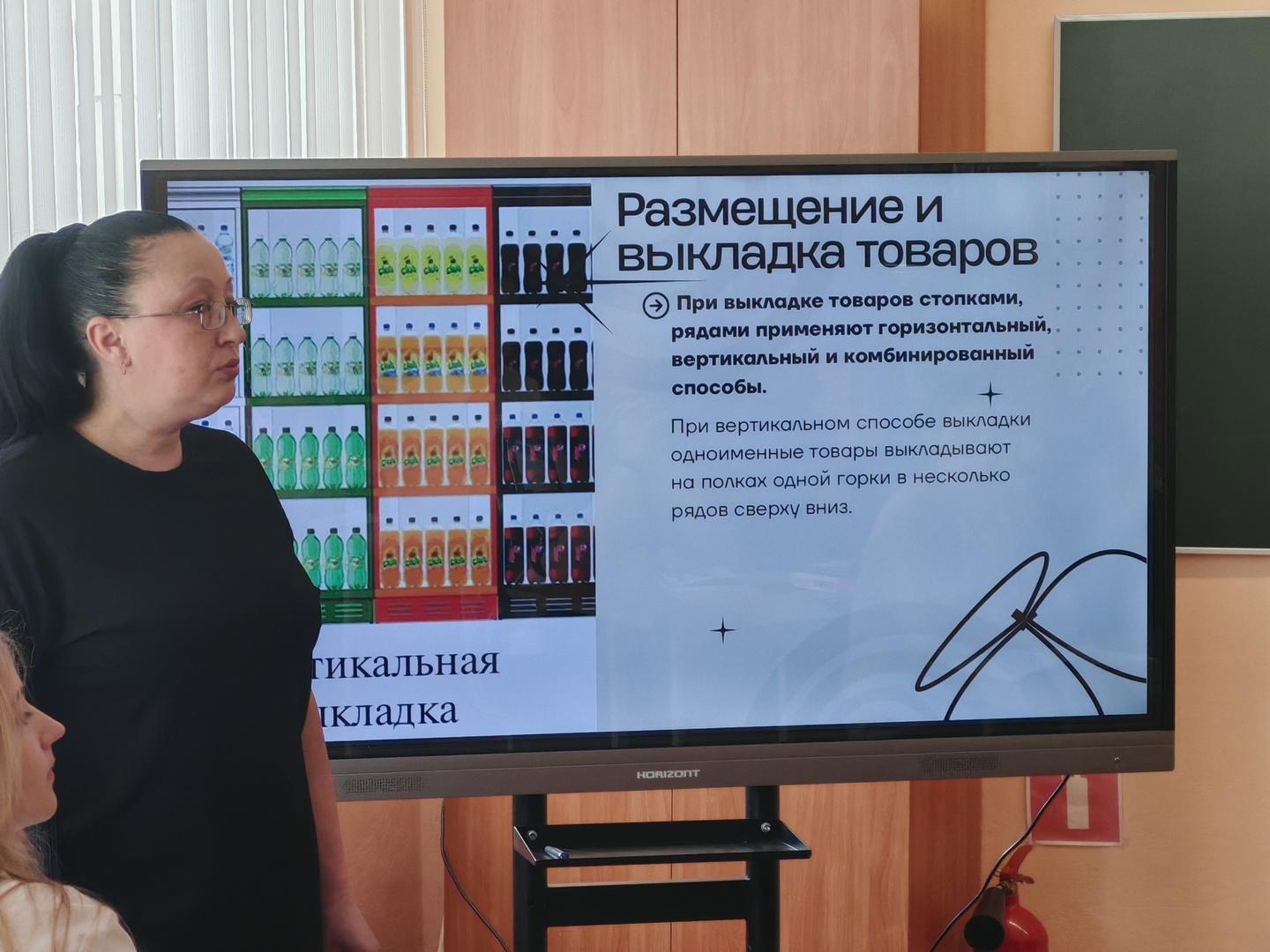 Екатерина Александровна наглядно продемонстрировала будущим продавцам, как грамотное зонирование, «золотая полка» и правила товарного соседства влияют на покупательский спрос. Учащиеся не только повторили теорию, но и в режиме реального времени выполнили практическое задание: организовали выкладку условного ассортимента, избегая типичных ошибок.