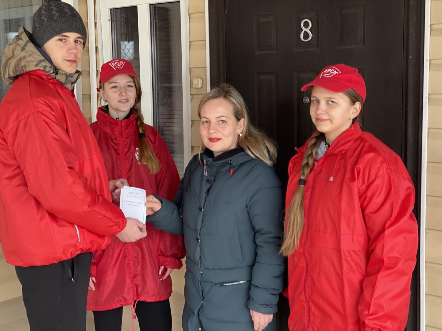 17 февраля 2022 года активисты ПО ОО «БРСМ» УО «Хойникский ГПЛ» в преддверии проведения республиканского референдума по внесению изменений и дополнений в Конституцию Республики Беларусь, приняли участие в информационной акции «От двери к двери». Целью данной акции является приглашение избирателей проявить свою гражданскую позицию и принять участие в республиканском референдуме, информирование о дате республиканского референдума и досрочного голосования, расположении избирательного участка.