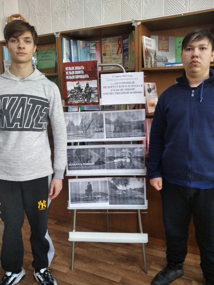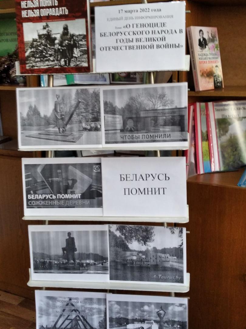 17 марта 2022 года, в рамках единого дня информирования, библиотекарь провел час памяти «О геноциде белорусского народа в годы Великой Отечественной войны». 2022 год в нашей стране объявлен Годом исторической памяти. С 2021 года Генпрокуратура Республики Беларусь расследует уголовное дело, направленное на установление фактов геноцида против мирного белорусского населения, немецкими захватчиками и их пособниками во время Великой Отечественной войны. Сегодня это необходимо для того, чтобы пресечь попытки переписать историческую правду и память о Великой Отечественной войне. Народ не знающий своего прошлого, не имеет будущего. Была оформлена выставка.