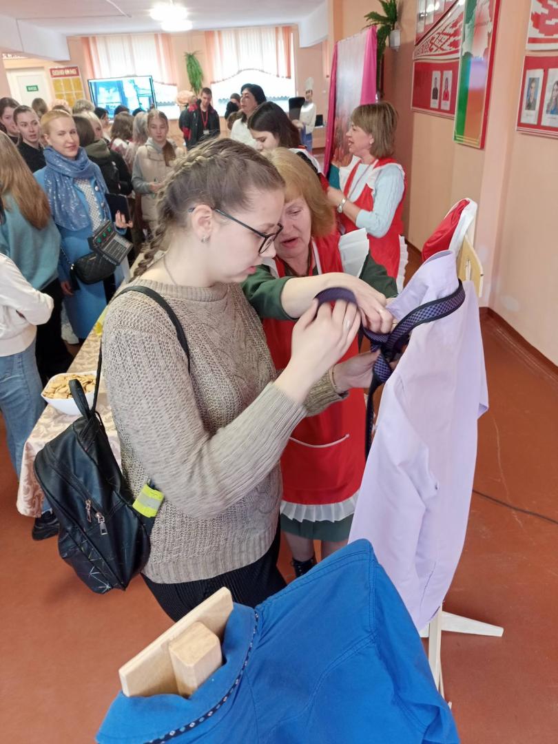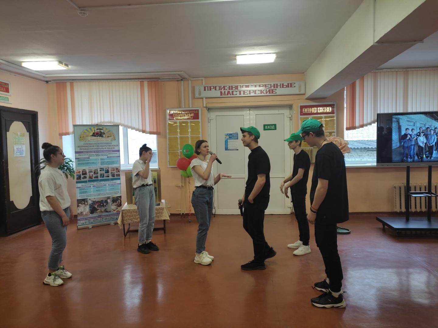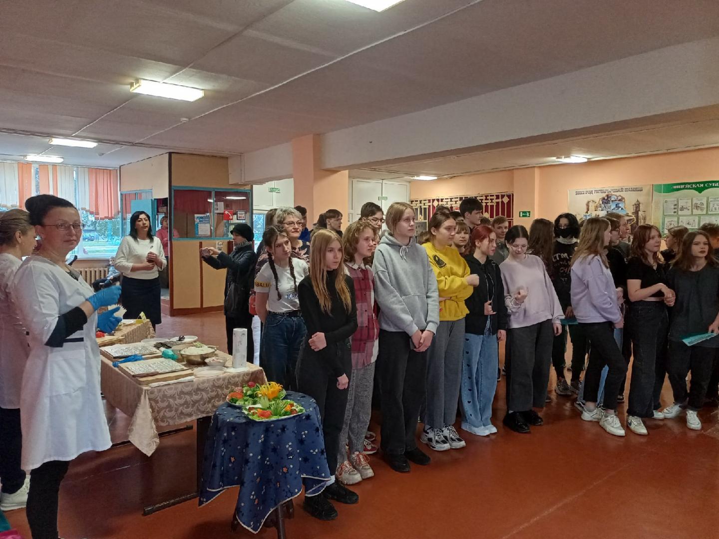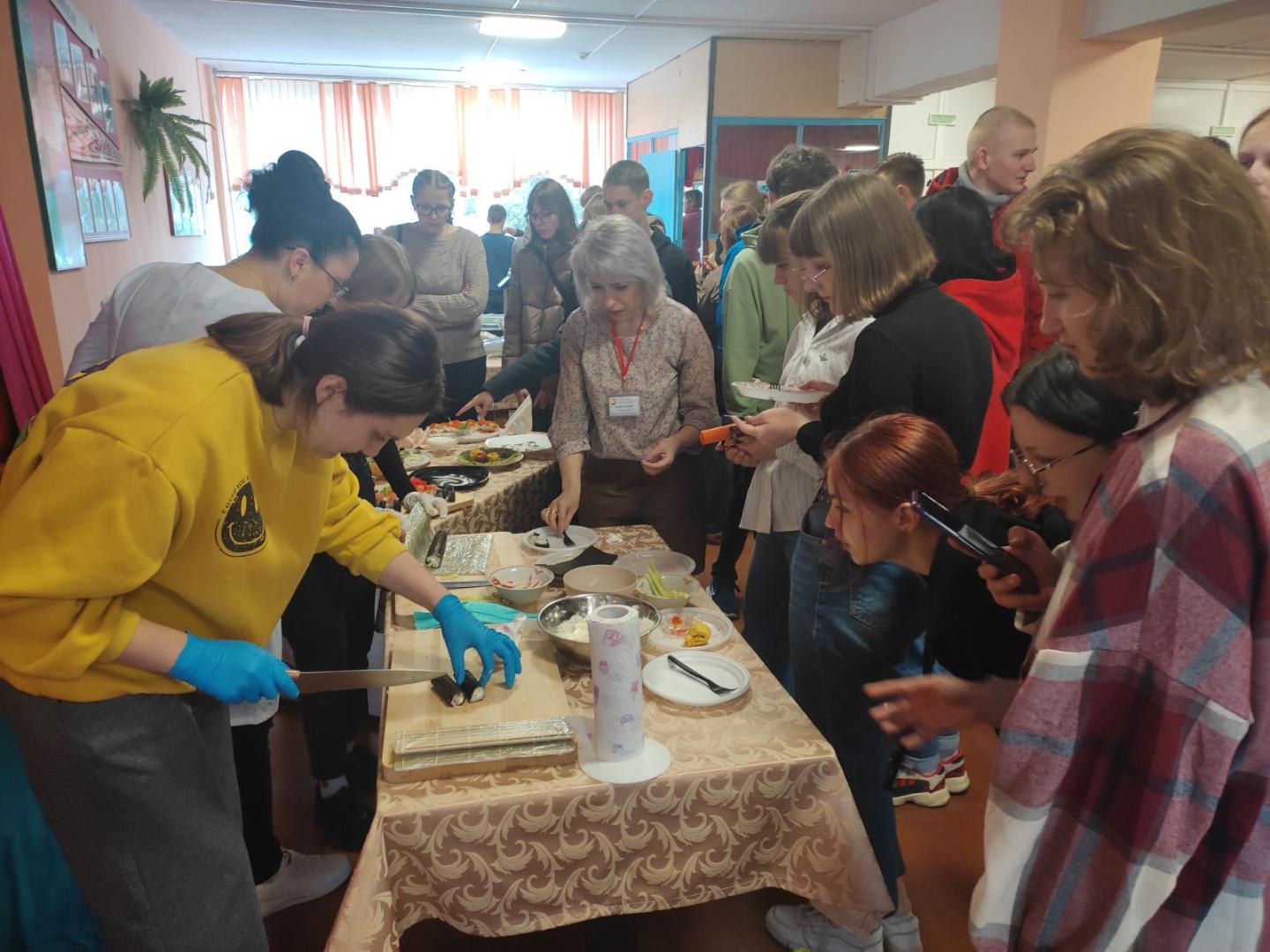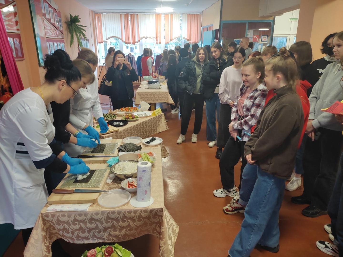 Далее выступили учащиеся лицея с музыкальным проф-баттлом. Затем все перешли на мастер-классы, где могли поучаствовать в приготовлении роллов и суши, проверить свои знания в ПДД, попробовать себя в роли продавцов, а также научиться завязывать галстук.