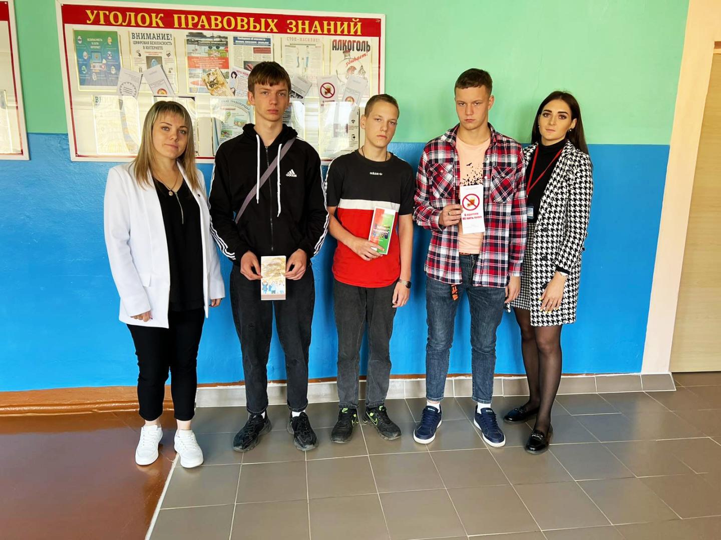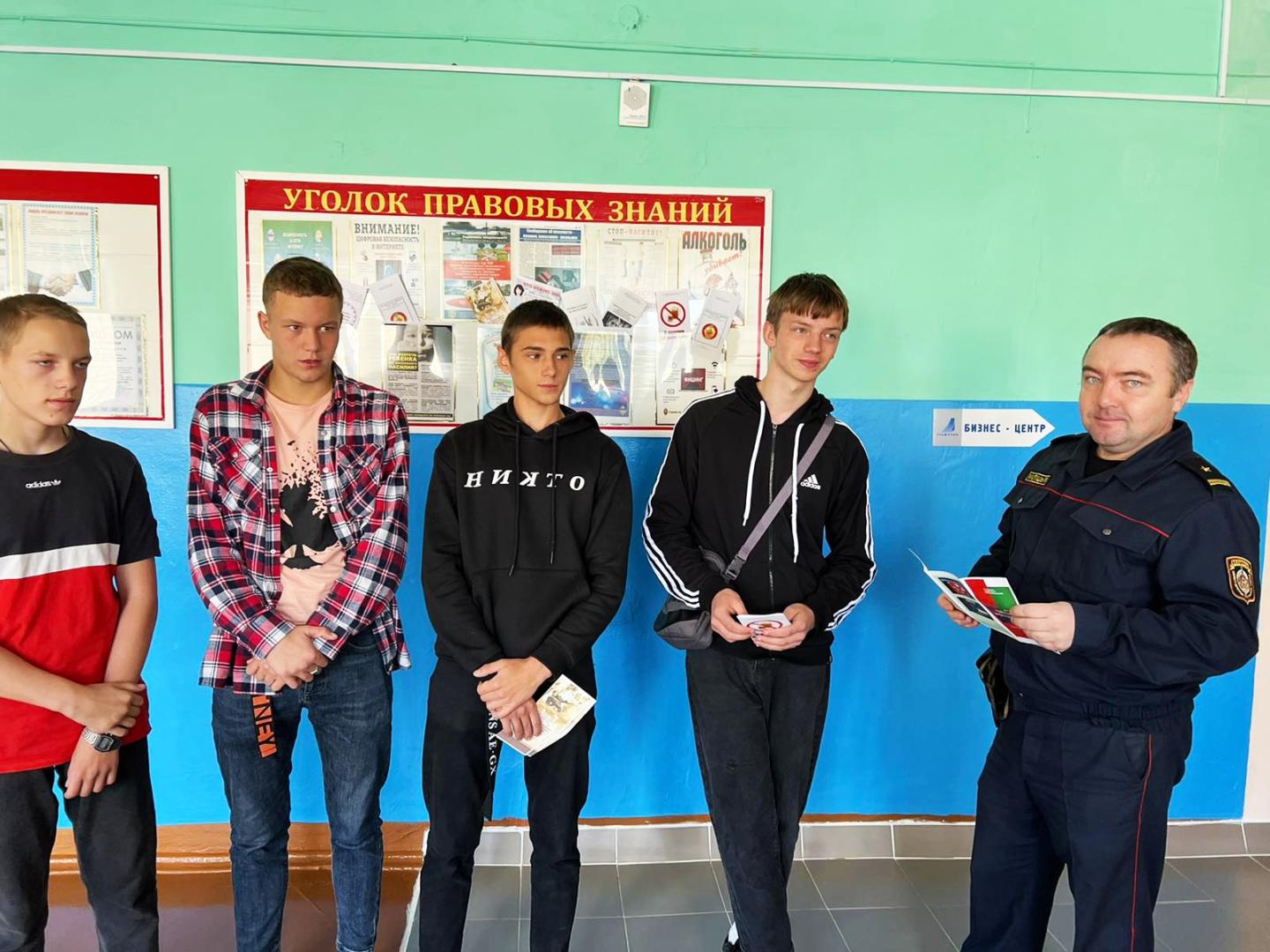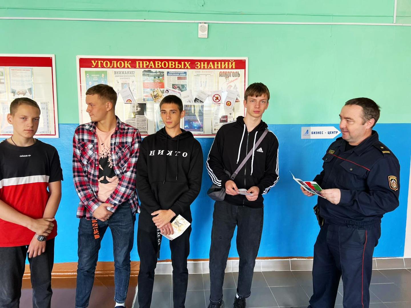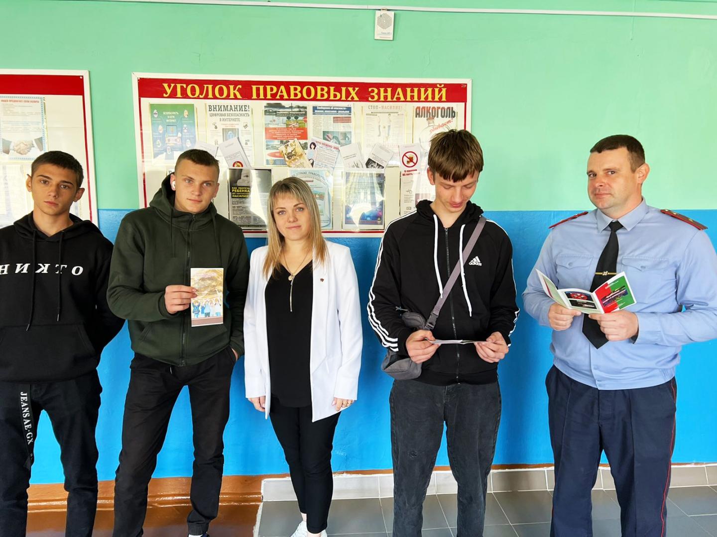 09.09.2022г. было проведено профилактическое мероприятие с участием: первого секретаря РК ОО «БРСМ» Ивлевой Н.В., начальника ИДН Вергейчика С.М. и инспектора ИДН Буйневича В.В. С использованием материалов, размещенных на стенде «Уголок правовых знаний», была проведена беседа по вопросам профилактики потребления несовершеннолетними алкогольных, слабоалкогольных напитков и пива, наркотических веществ, об ответственности за совершение правонарушений и преступлений.
