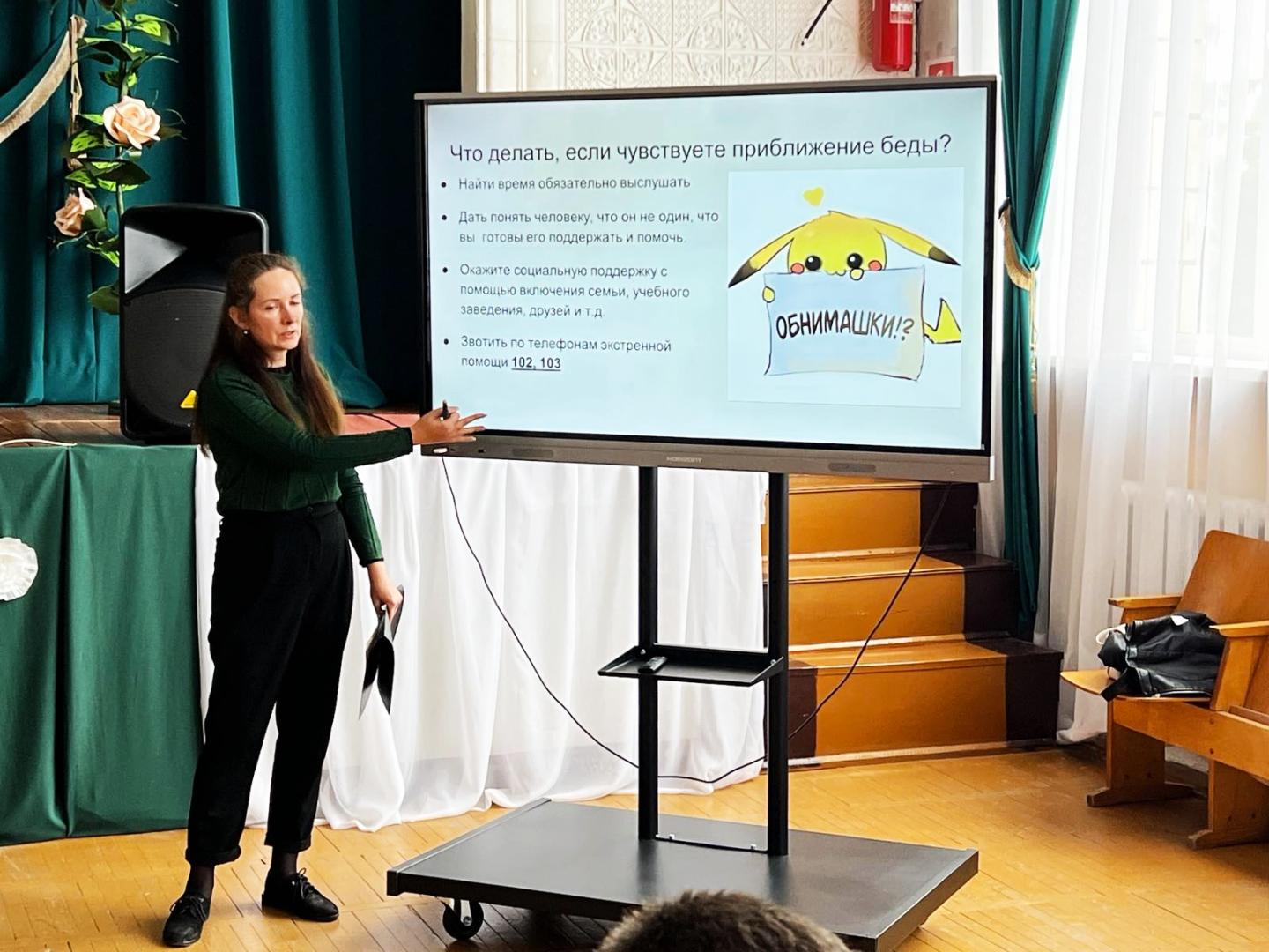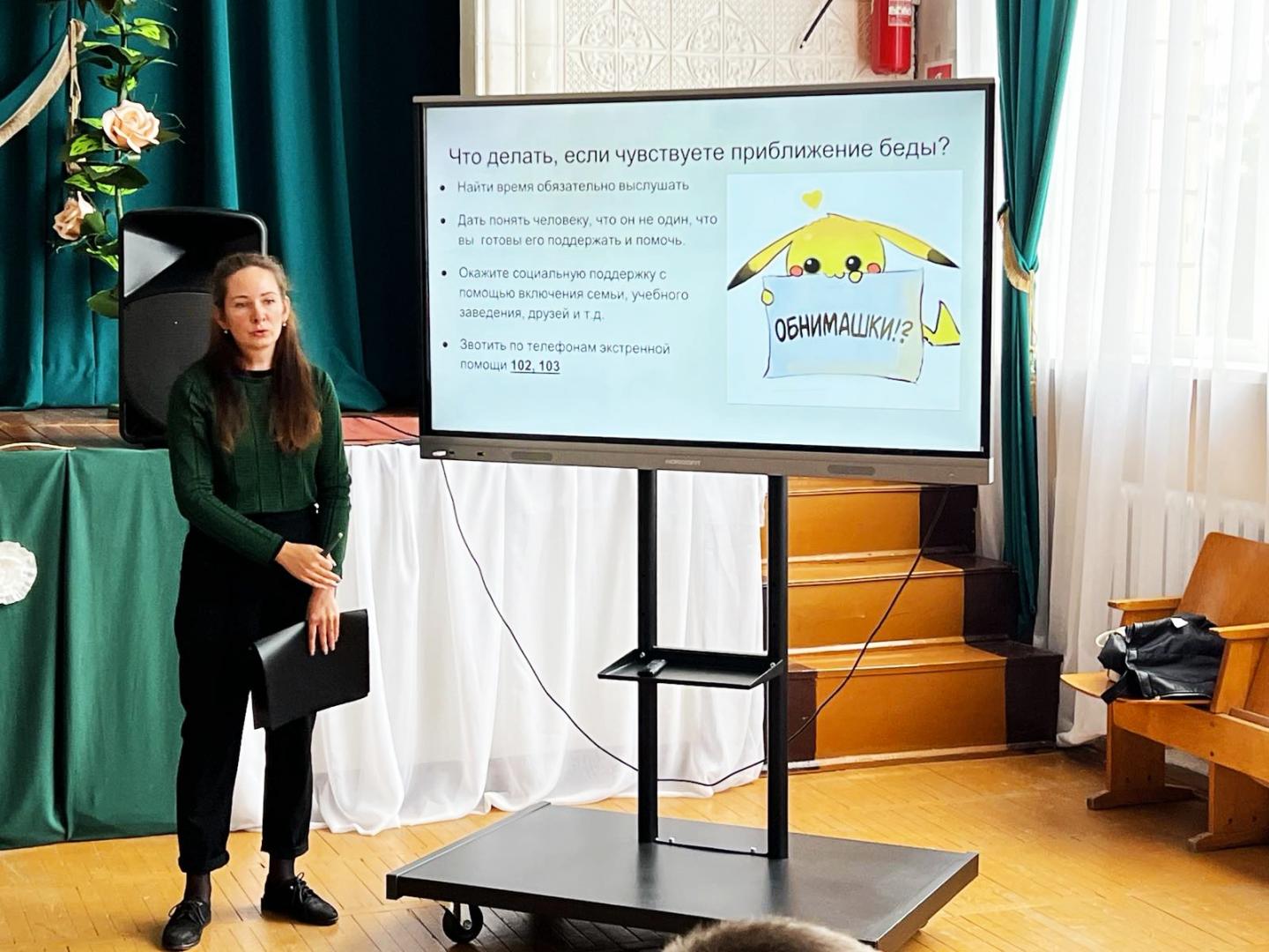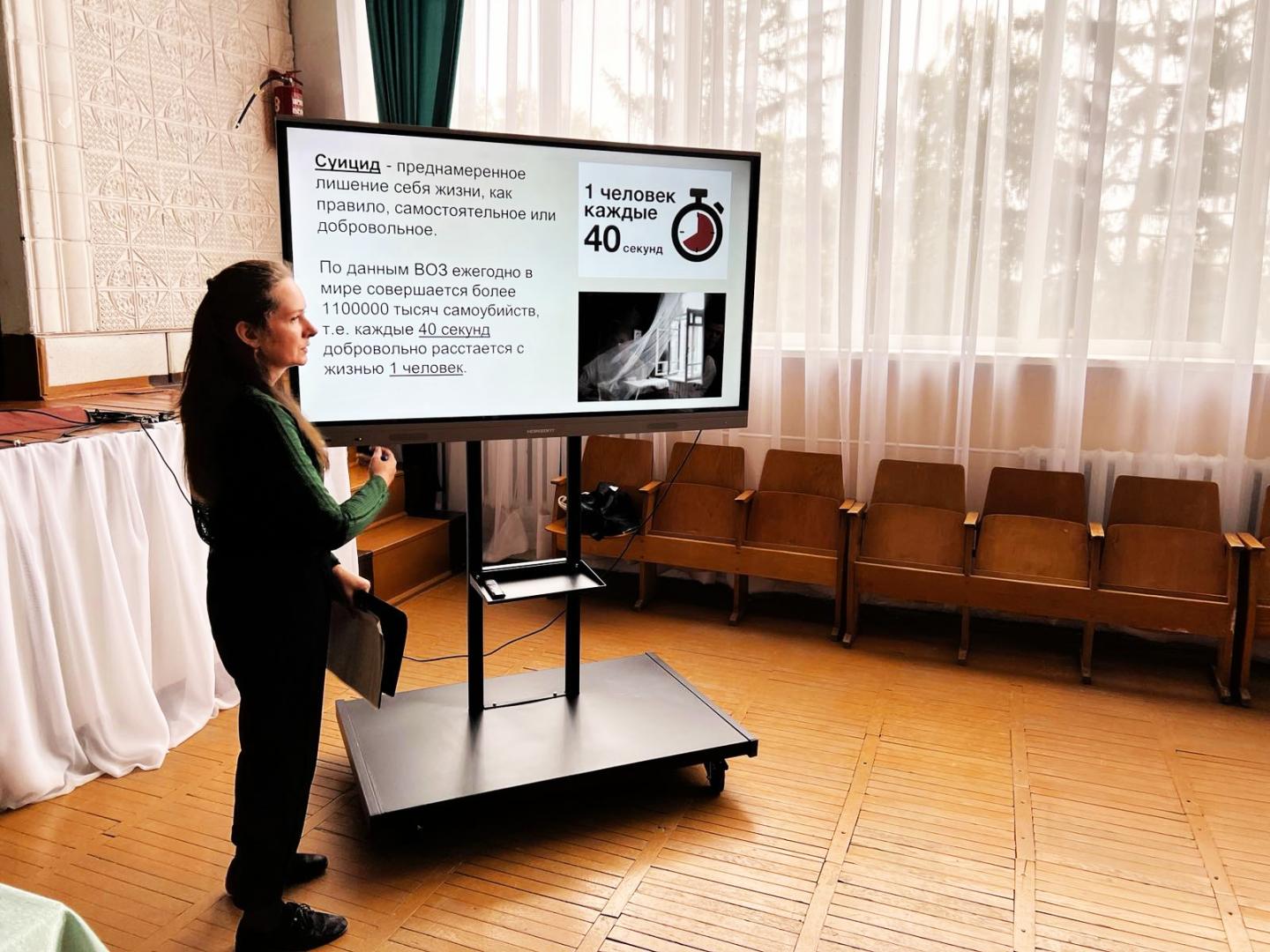 15.09.2022г. психолог УЗ «Хойникская ЦРБ» Жиглова Н.В. провела с учащимися УО «Хойникский ГПЛ» мероприятие, направленное на профилактику суицидального поведения подростков, с просмотром тематических видеороликов.
