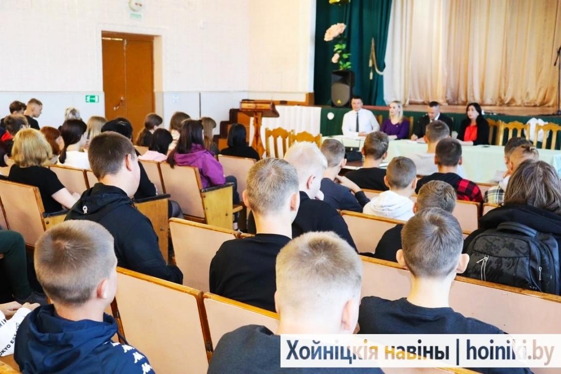 Информационно-разъяснительное мероприятие для учащихся первого курса обучения с участием субъектов профилактики района: Кушнером С.Н., заместителем председателя Хойникского райисполкома, Якуниным Н.Н., заместителем начальника ХойникскогоРОВД, Токарской О.В., заместителе председателя КДН Хойникского райисполкома.