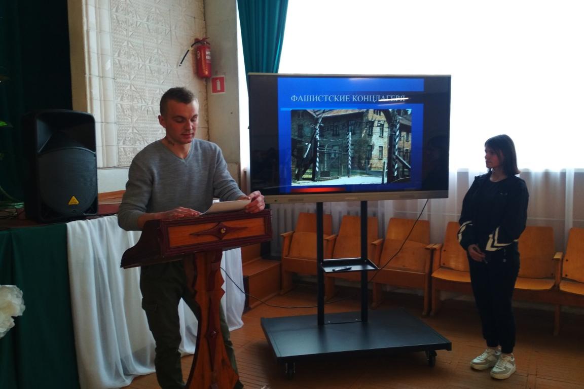 Накануне Международного дня освобождения узников фашистских концлагерей в РДК организовали видеолекторий «Узники нацизма". Юные участники поискового отряда профлицея "Молодая гвардия» читали вслух со сцены письма детей из концлагеря "Озаричи", на большом экране демонстрировались кадры из документального фильма о концлагере.