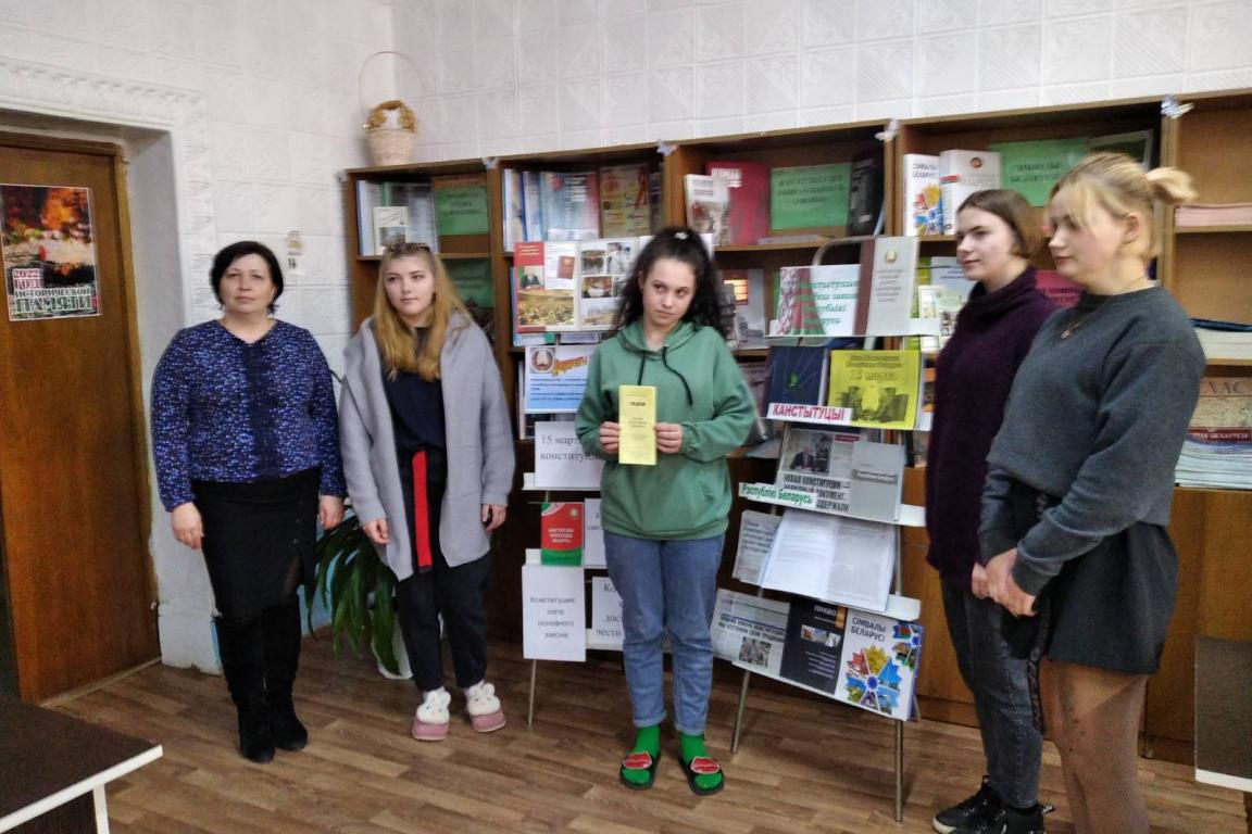 Библиотекарь, вместе с центральной библиотекой, провела тематический час, посвященный дню Конституции Республики Беларусь. В жизни любого общества и государства Конституция играет особую роль, ее принятие — знаковое событие для каждой страны. Наша Конституция, сосредоточила в себе богатый исторический опыт и мудрость предыдущих поколений.