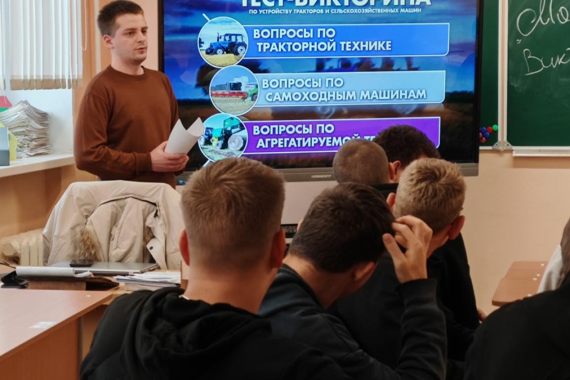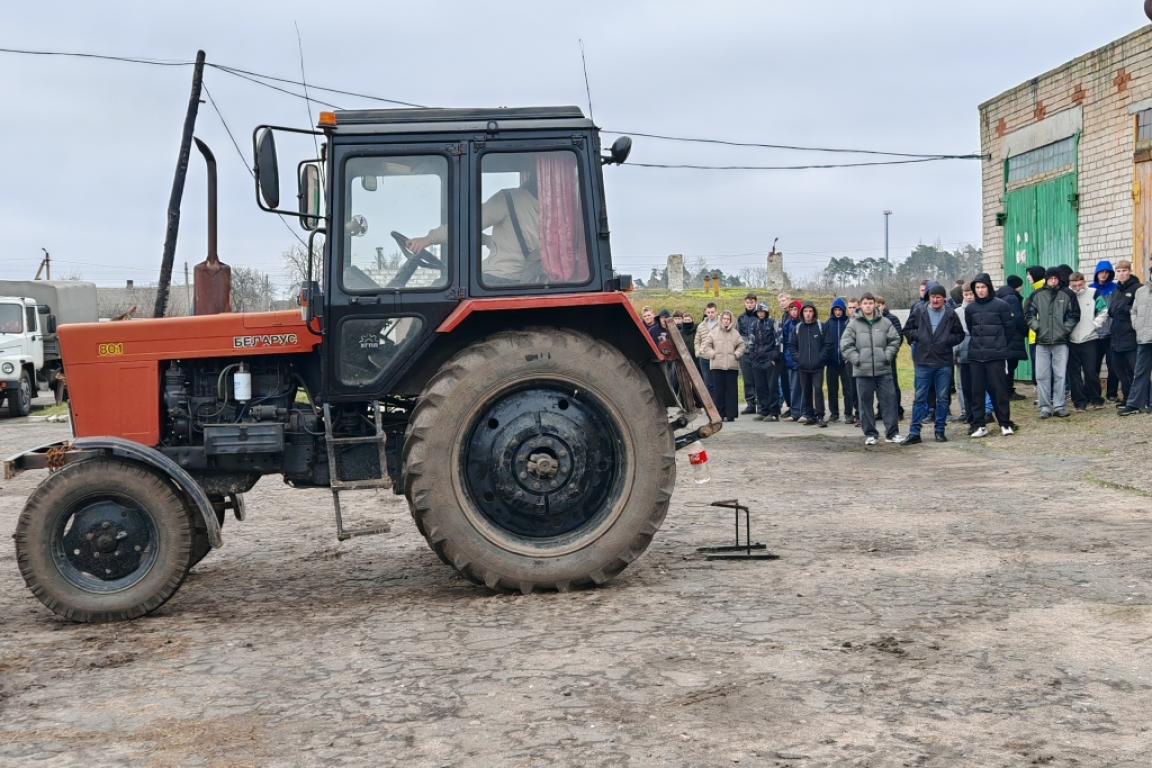 В рамках тематической недели «Мастер своего дела» учащиеся группы №36 Кузьменко Иван и Позняк Сергей для парней 1 и 2 курсов показали свои умения по управлению трактора, а именно подъезд к условной сельскохозяйственной машине и пользование гидравлической системой трактора.